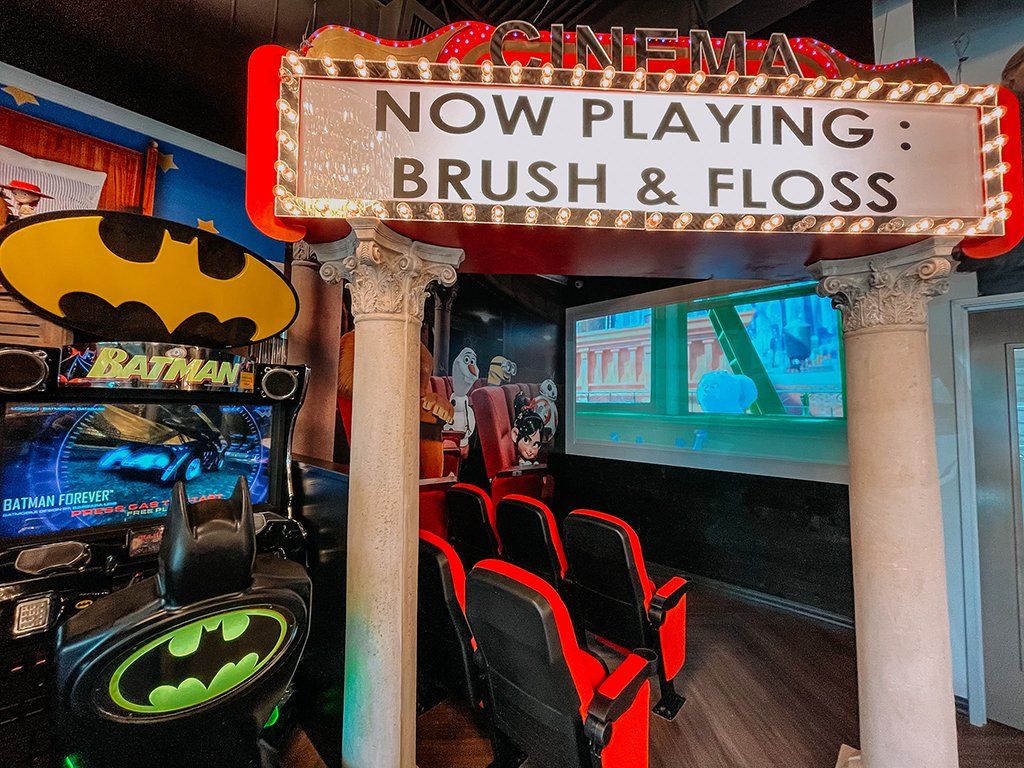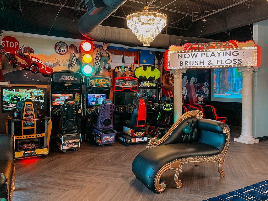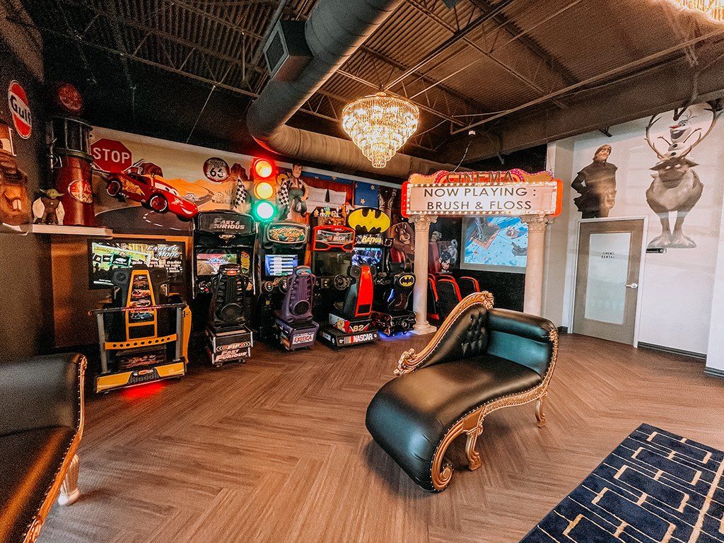 Before setting foot in our office, we invite you to take a virtual tour of Cinema Dental and experience the magic for yourself. Navigate through our enchanting lobby, where you'll be greeted by the sight of a full arcade, complete with classic games and modern favorites. Hear the laughter and excitement of children as they explore the game stations and engage in friendly competitions. As you continue your virtual journey, you'll catch a glimpse of our HD TVs playing popular kids' movies, creating a lively and entertaining atmosphere. Venture into our modern treatment rooms, equipped with the latest dental technology and designed with your comfort as our top priority. From the ergonomic chairs to the soothing color schemes, every detail has been carefully considered to create a relaxing and inviting space. During your virtual tour, you'll also have the opportunity to meet the friendly faces of our professional staff, who are ready to welcome you with warm smiles and exceptional service. By taking this virtual tour, you'll get a sense of the unique and captivating environment that sets Cinema Dental apart as your premier Dallas dentist.